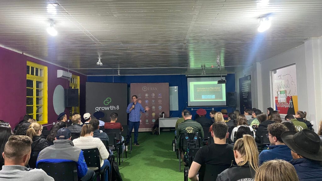Durante a fala, o professor destacou a importância de aliar conhecimento técnico à paixão pelo cuidado com os animais, e incentivou os acadêmicos a enxergarem na profissão um espaço de múltiplas possibilidades, incluindo o empreendedorismo na Medicina Veterinária.