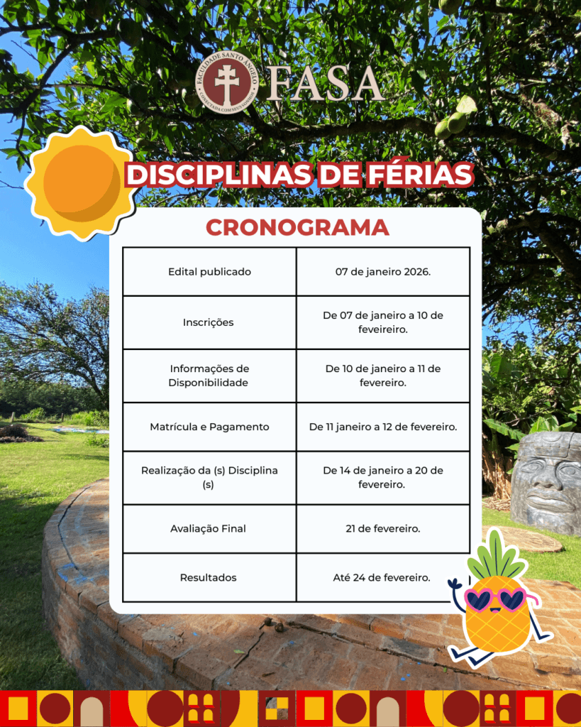 Sabemos que esse é momento do seu descanso e, ele é fundamental. Mas, as férias também podem ser uma oportunidade ideal para adiantar a graduação, recuperar disciplinas ou até expandir seus conhecimentos. Pensando nisso, a Faculdade Santo Ângelo (FASA) está com inscrições abertas para as Disciplinas de Férias 2026, uma oportunidade prática, flexível e totalmente on-line.